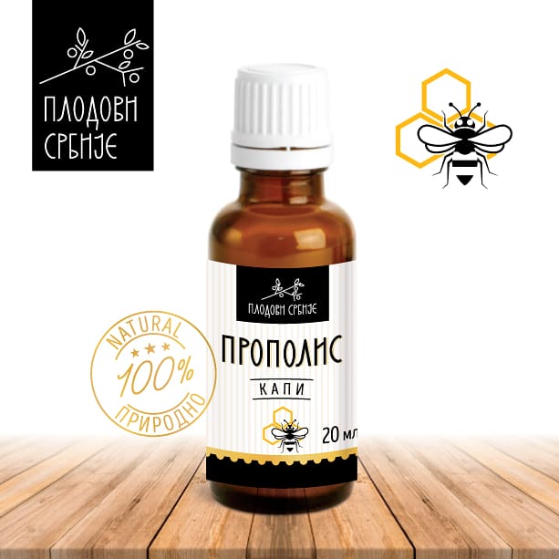 „Propolis je prirodni pčelinji antibiotik koji uništava preko 100 različitih vrsta mikroorganizama (bakterije, viruse, gljivice, protozoe i dr.), mnoge otrovne materije, plesni i izazivače parazitskih oboljenja u organizmu. To je lepljiva, smolasta materija žutozelene do tamne boje koju sakupljaju pčele svojim usnim aparatom sa pupoljaka biljaka. Sadrži 55 % biljnih smola, 30 % voska, 10 % etarskih ulja i 5 % cvetnog praha, mineralne materije, vitamine B1, B2, C, E. Od svih sadržaja 30 – 40 % su flavonoidi sa dokazanom biološkom aktivnošću, koji imaju izvanredno dejstvo na jačanje imuniteta organizma. Flavonoidi su posebno efikasni protiv virusa. Uz to, propolis ima protivmikrobna svojstva, (baktericidno i bakteriostatično) u odnosu na mnoge patogene, a naročito gram – pozitivne bakterije. Poseduje veoma značajne osobine, kao: bakterije mu se ne mogu prilagoditi, nije toksičan, ne oštećuje normalnu crevnu floru, povećava protivmikrobnu aktivnost nekih antibiotika – penicilina, tetraciklina i drugo. Primena propolisa danas veoma je raznovrsna, a paleta njegove upotrebe veoma široka. Propolis se sa sigurnošću može koristiti za dezinfekciju usne šupljine, kao profilaktičko sredstvo protiv gripa i nazeba, inhalaciju grla i nosa, lečenje paradentopatija, suzbijanje zadaha i zacelivanje okolozubnog tkiva, lečenje ekcema, rana, ogrebotina, opekotina, lečenje hemoroida, lečenje hroničnog kolitisa, lečenje čira na želucu i dvanestopalačnom crevu, lečenje kurjih očiju i žuljeva, bubuljica, akni, herpesa, bradavica, proširenih vena, u ginekologiji za lečenje rana na grliću materice i infekcija, lečenje usne duplje i sinusa, gornjih disajnih puteva i plućnih bolesti, jačanje imuniteta, lečenje kardiovaskularnih obolenja, endokrinih poremećaja, lečenje  raznih uroloških smetnji. Gotovo sve aktivnosti propolisa zasnivaju se na njegovoj antioksidativnoj ulozi dobrih hvatača slobodnih radikala (protektora) u parovima.